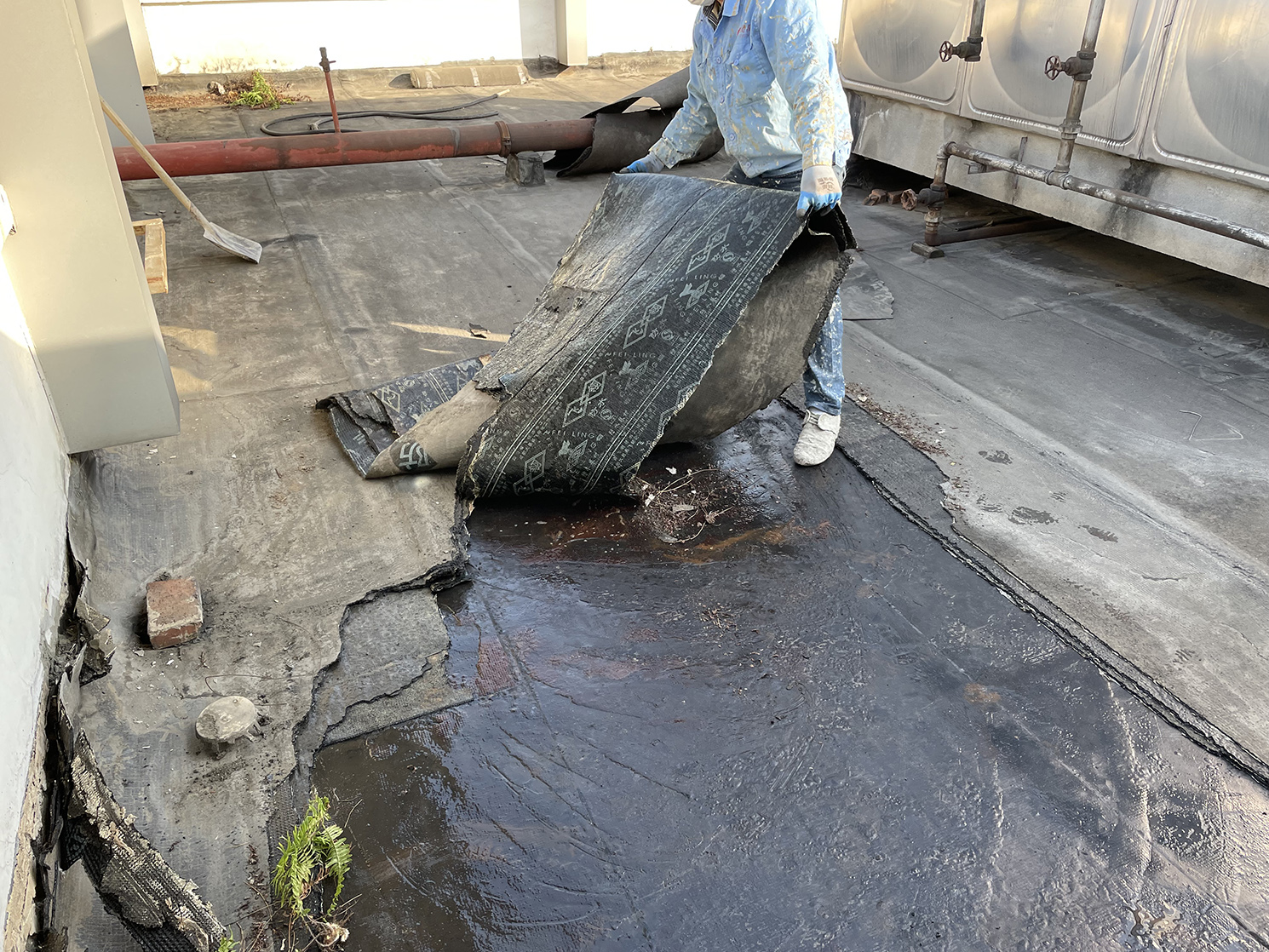 SBS改性瀝青防水卷材作為最近二十年的最常用的屋頂防水卷材,在使用了一段時間的過程中,也逐漸顯現出了他的弊端,SBS改性瀝青防水卷材施工對屋頂基面的水分有要求,需要基面很干燥,但是實際情況是屋頂的基面很難達到SBS改性瀝青防水卷材施工要求的干燥程度,這樣的情況下屋頂鋪貼了SBS改性瀝青防水卷材之后,基面的水分在夏季高溫的情況下形成水汽累積在防水卷材下面,SBS改性瀝青防水卷材就與基面分開了,就是所謂的雨傘式防水層,整個屋頂防水卷材沒有問題的話就可以起到防水作用,但是在以后由于地震或者其他因素,個別地方防水層被損壞了之后,水從這個部位漏到防水卷材下面去了,水就在防水卷材下面四周到處擴散,導致屋頂防水卷材下面到處都是水,防水卷材的防水作用就完全失去了防水作用。(下面就是屋頂原來做的SBS改性瀝青防水卷材,漏水了之后揭掉防水卷材之后看到防水卷材下面水到處竄)