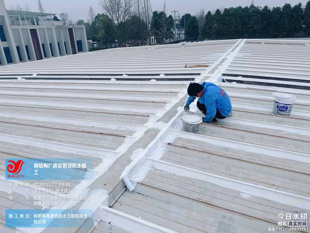 在施工過程中,成都蜀禹建筑防水工程有限責任公司采用了專業的防水材料和先進的施工技術。首先,針對彩鋼瓦的接縫和固定螺釘部位,公司使用了SYR金屬屋面專用防水涂料和專用縫織聚酯布進行防水涂刷鋪貼施工。在施工過程中,施工人員嚴格按照一布三涂的方案進行操作,確保每一層涂刷均勻、無遺漏。同時,對于彩鋼瓦接縫及固定螺釘處理,施工人員特別加強了15cm寬的聚酯布,確保防水效果更加持久。
