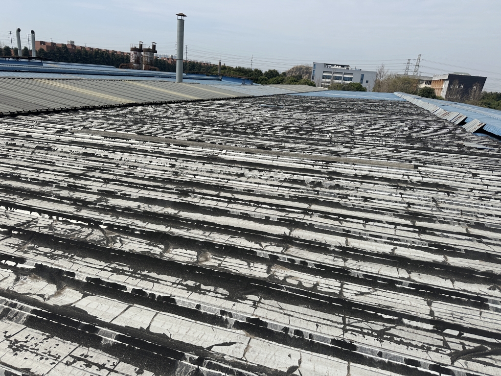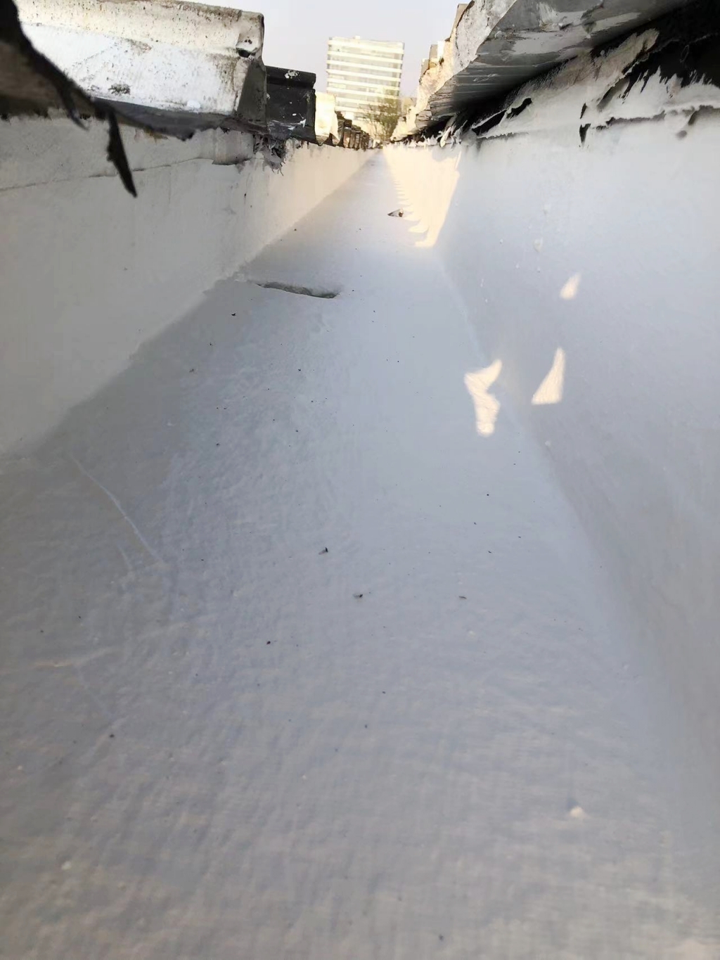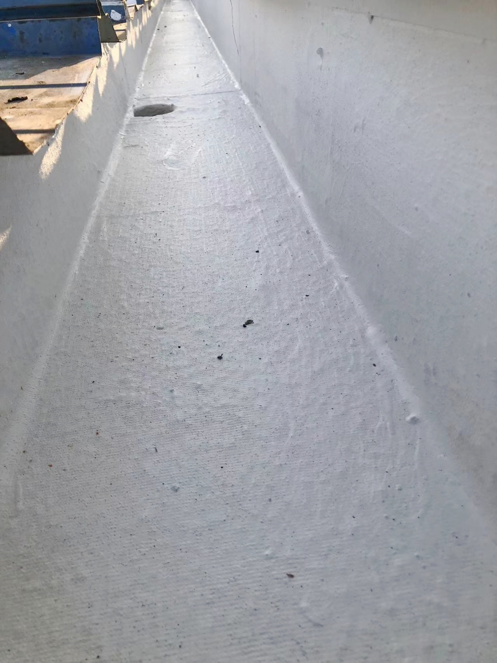 在施工過程中,公司技術團隊首先揭掉了天溝內的瀝青防水卷材,發現下方天溝已經銹蝕嚴重,出現了多處穿孔。針對這一問題,團隊先對天溝進行了除銹處理,并涂刷了免除銹納米固銹劑,有效阻止了銹蝕的進一步發展。隨后,團隊在天溝內涂刷了SYR金屬屋面專用防水涂料,并鋪貼了專用縫織聚酯布,以增強防水層的韌性和耐久性。最后,再在天溝表面涂刷了兩遍SYR金屬屋面專用防水涂料,確保防水效果達到**。