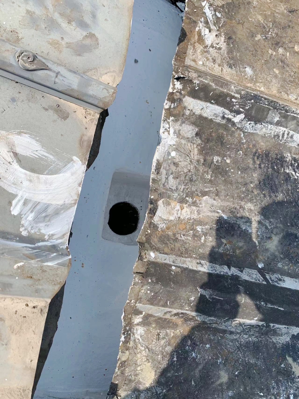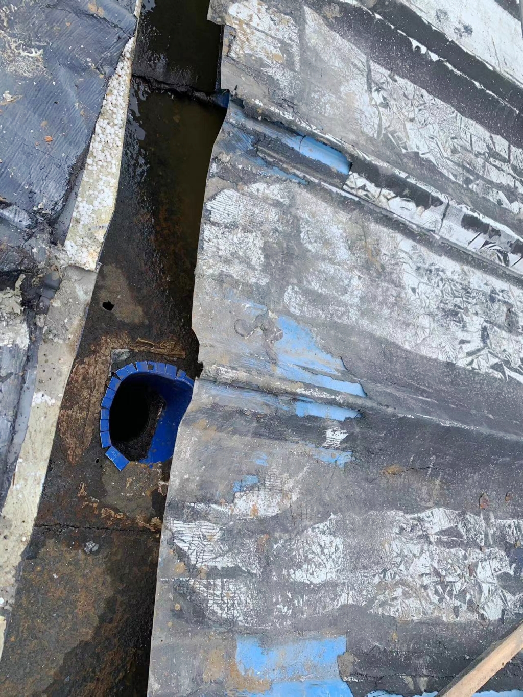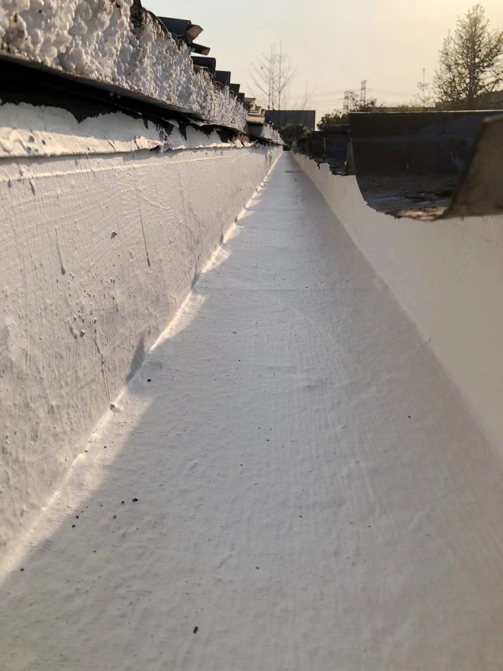 在施工過程中,公司技術團隊首先揭掉了天溝內的瀝青防水卷材,發現下方天溝已經銹蝕嚴重,出現了多處穿孔。針對這一問題,團隊先對天溝進行了除銹處理,并涂刷了免除銹納米固銹劑,有效阻止了銹蝕的進一步發展。隨后,團隊在天溝內涂刷了SYR金屬屋面專用防水涂料,并鋪貼了專用縫織聚酯布,以增強防水層的韌性和耐久性。最后,再在天溝表面涂刷了兩遍SYR金屬屋面專用防水涂料,確保防水效果達到**。
