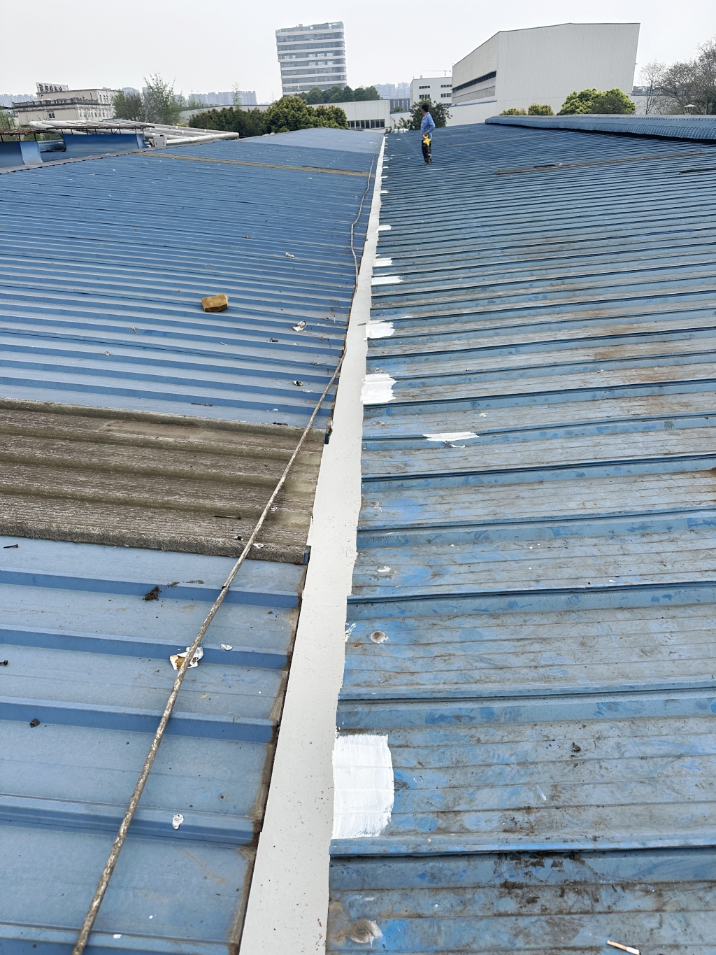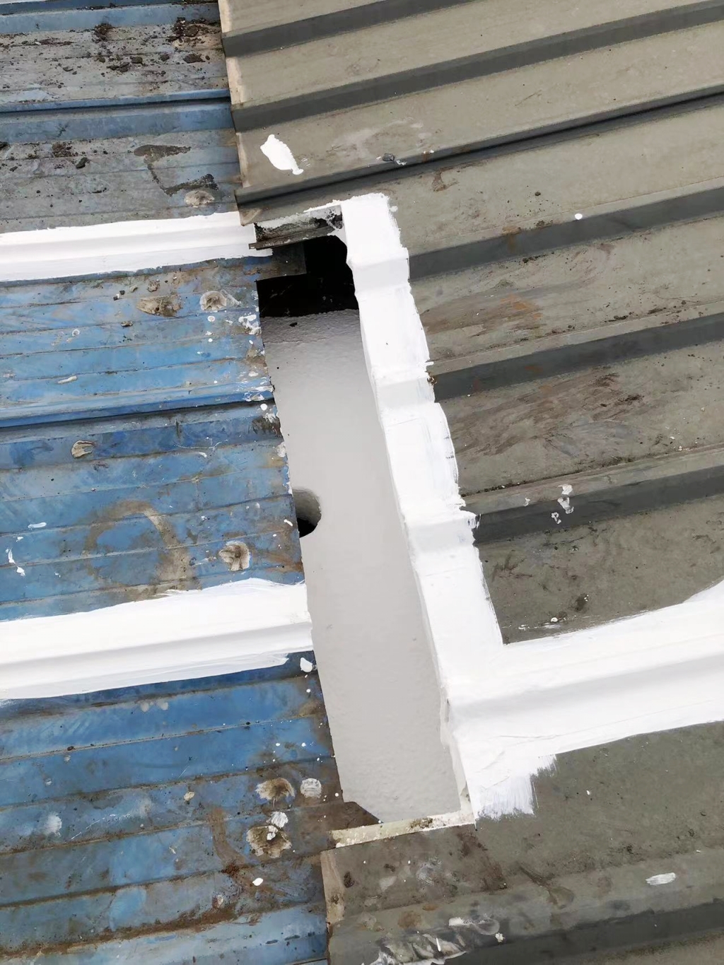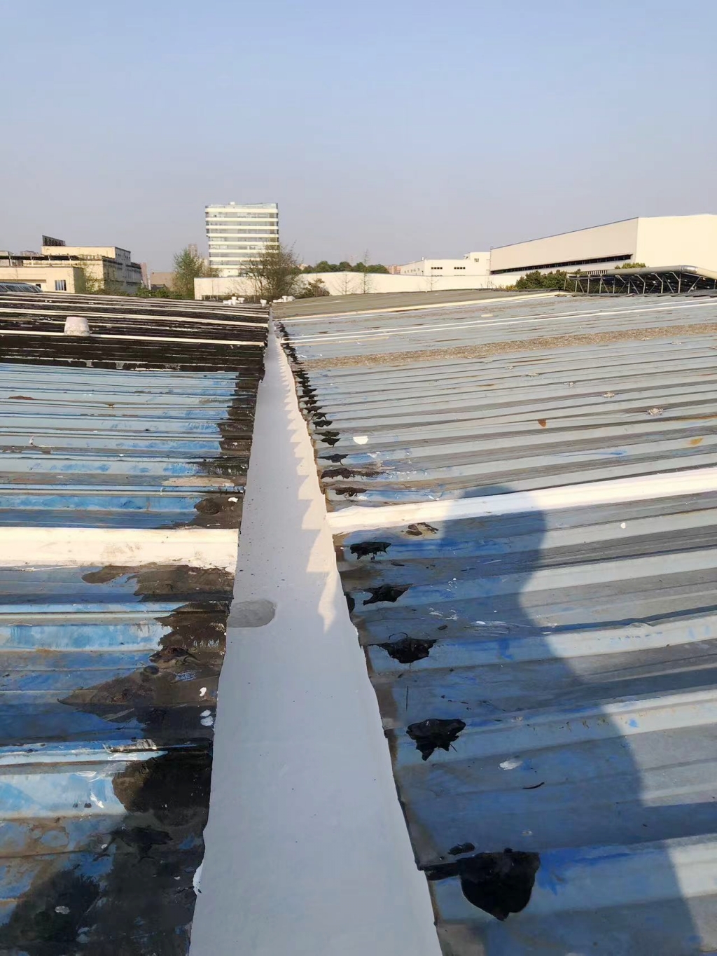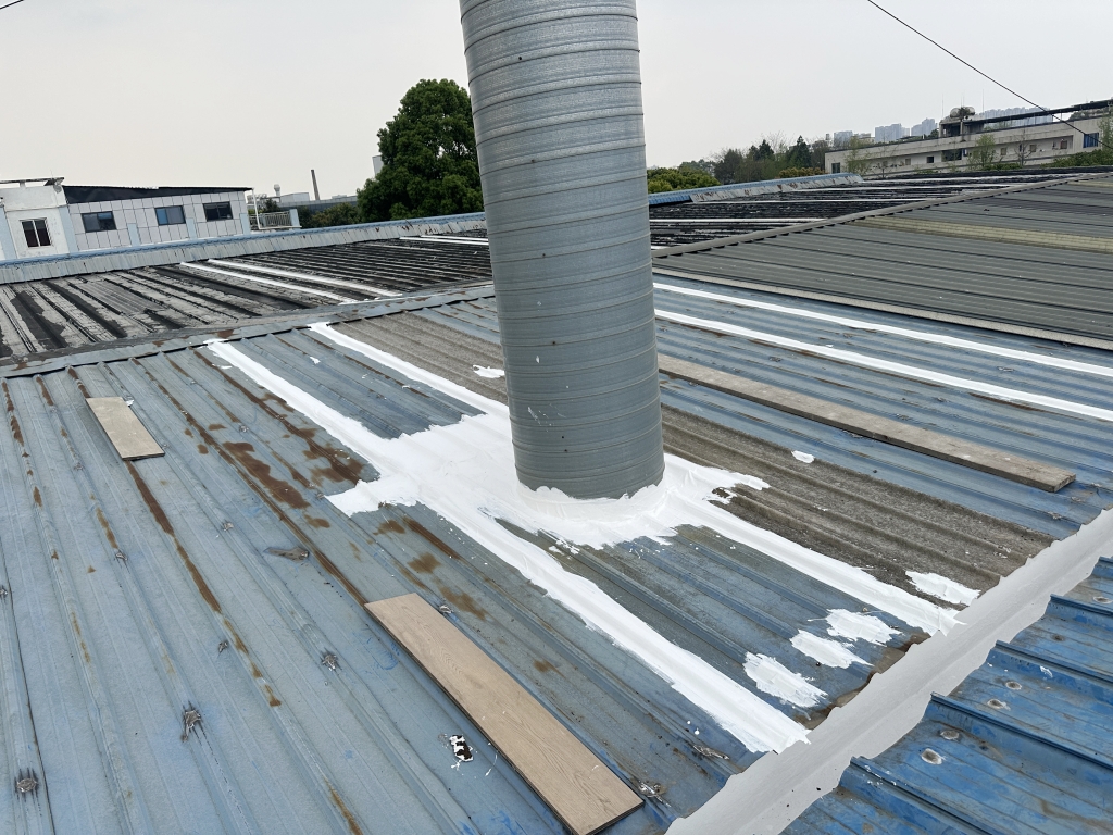 對于彩鋼頂斜坡表面彩鋼搭接縫的漏水問題,公司同樣采用了SYR金屬屋面專用防水涂料配合專用縫織聚酯布進行一布三涂的施工處理。這種施工方法不僅能夠有效密封搭接縫隙,防止水分滲透,還能夠提高彩鋼頂的整體防水性能。