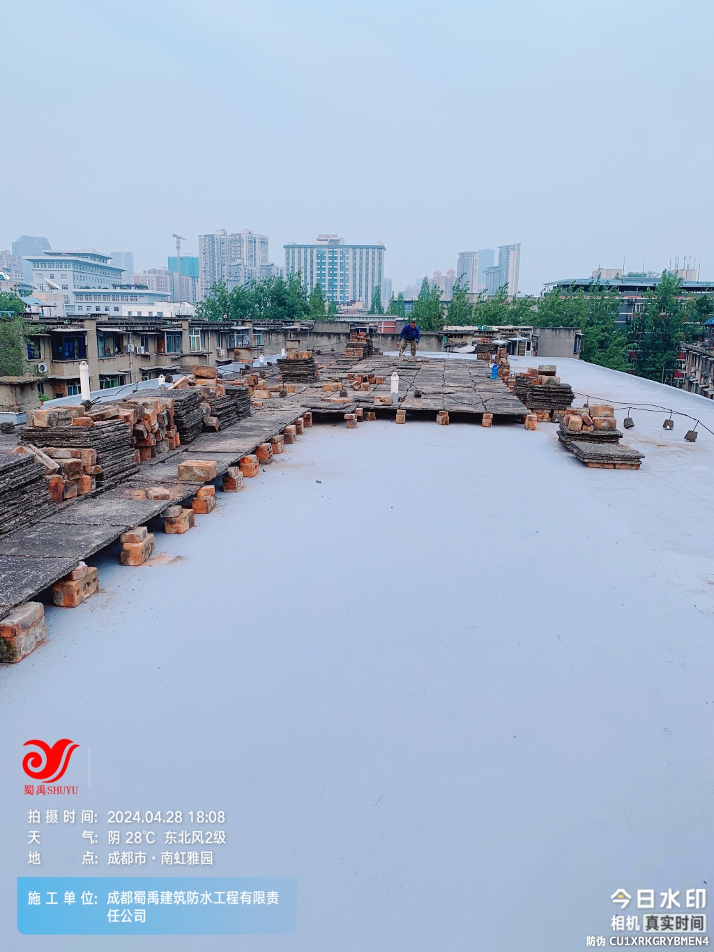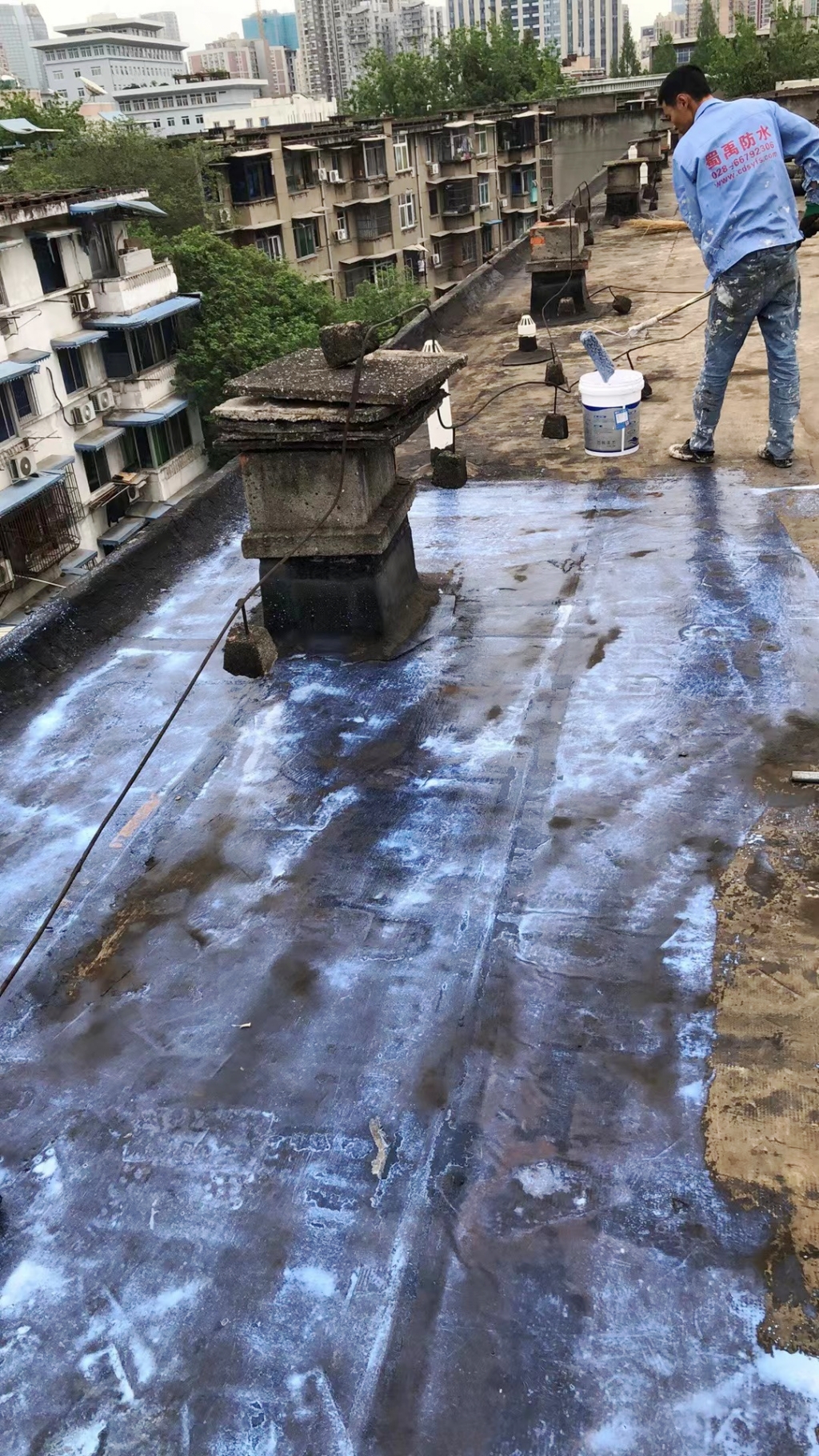 項(xiàng)目初期,蜀禹防水團(tuán)隊(duì)首先對(duì)屋頂進(jìn)行了全面的勘查與評(píng)估,隨后,施工隊(duì)伍小心翼翼地將屋頂表面的隔熱板逐一揭開,并將下方的磚塊逐一搬開,確保施工區(qū)域完全暴露且基層干凈無雜物。這一步驟雖然繁瑣,但為后續(xù)的防水處理奠定了堅(jiān)實(shí)的基礎(chǔ)。